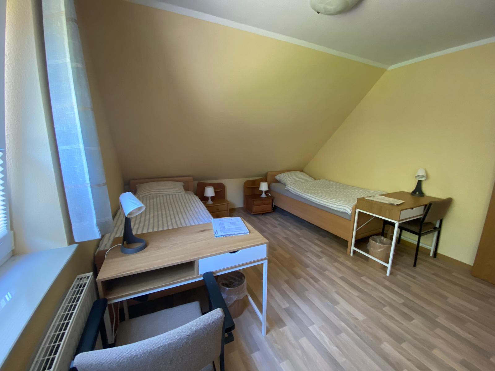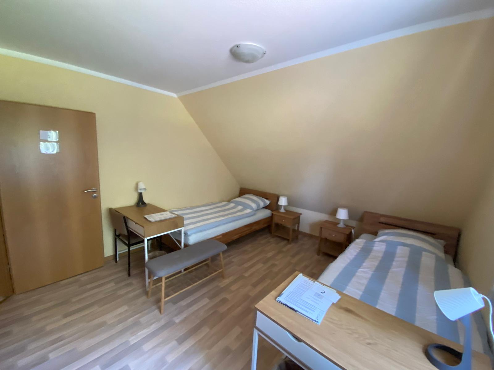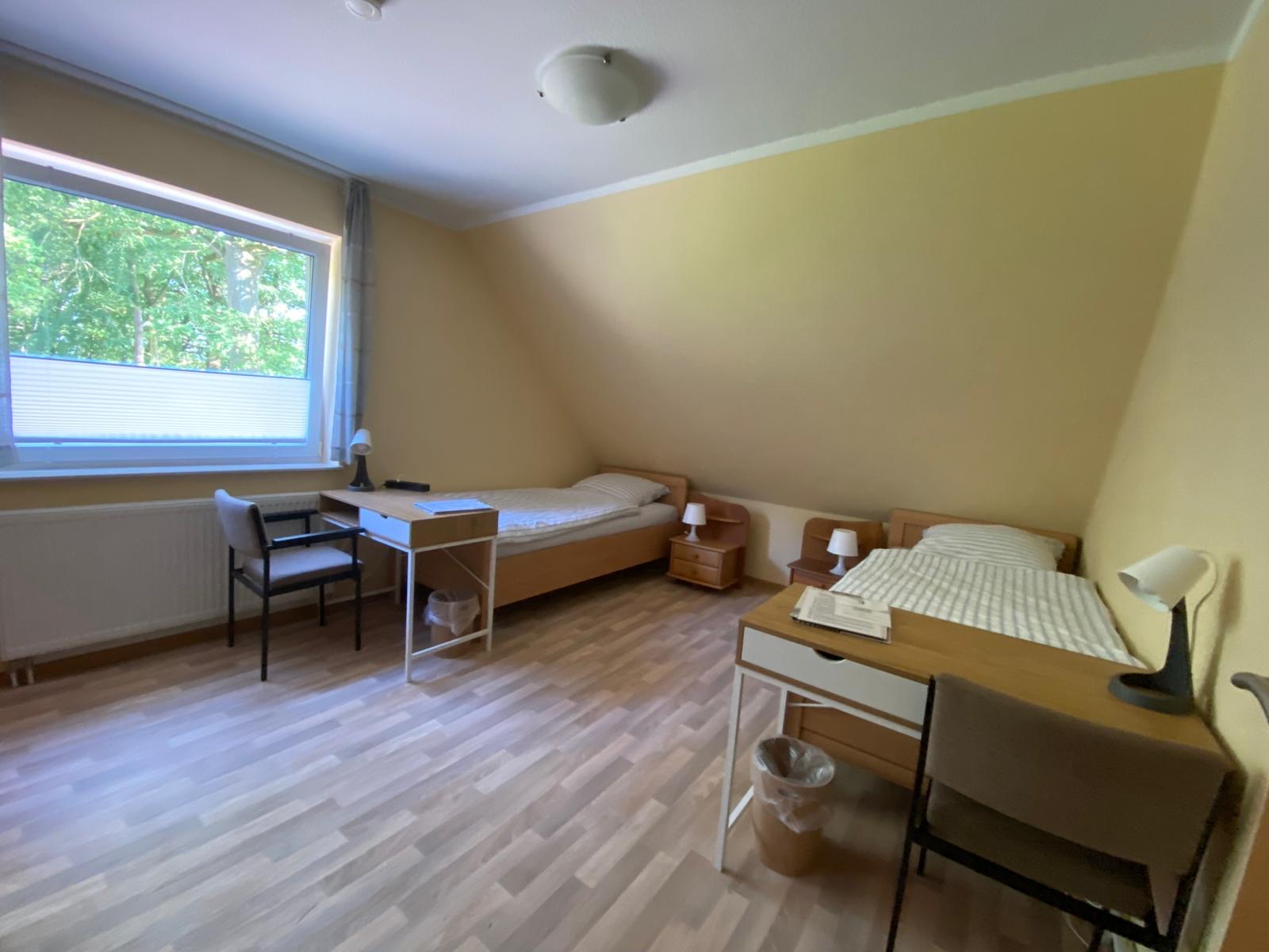 Doppelzimmer im Haus Willbrok mit zwei Betten, Schreibtisch und Kleiderständer.