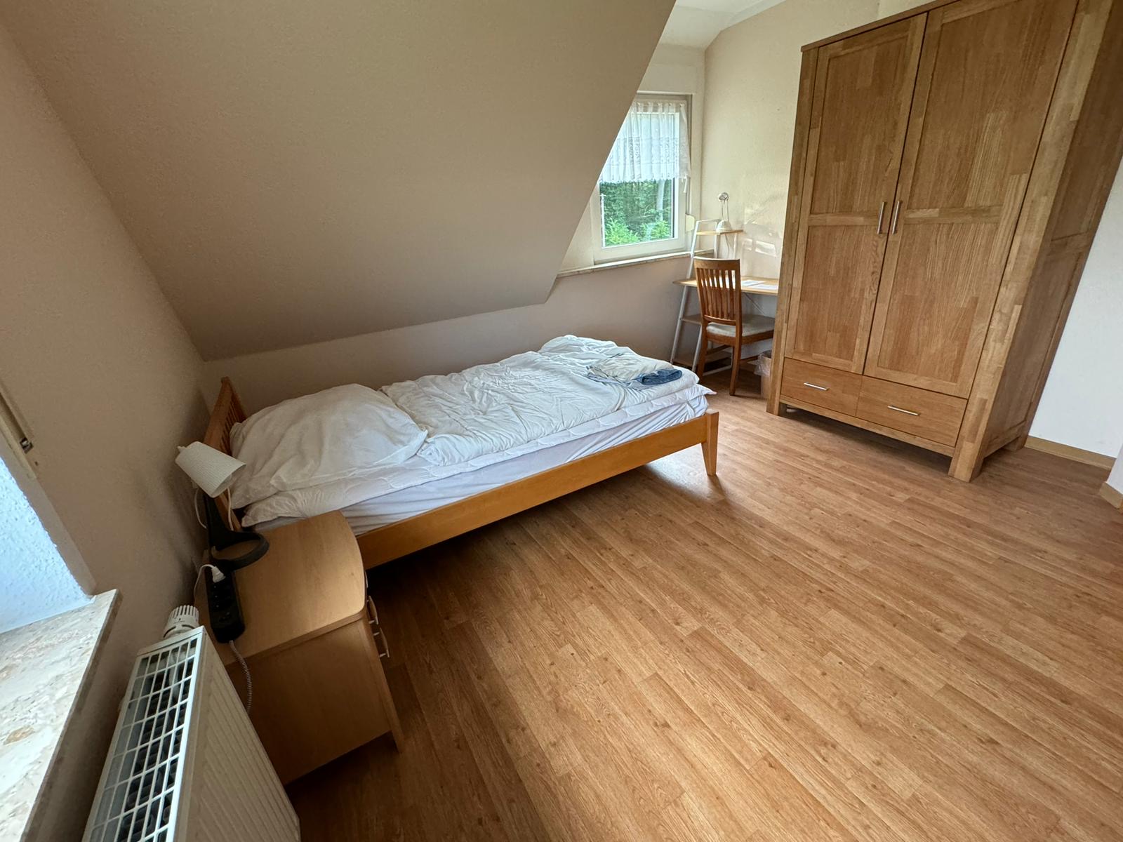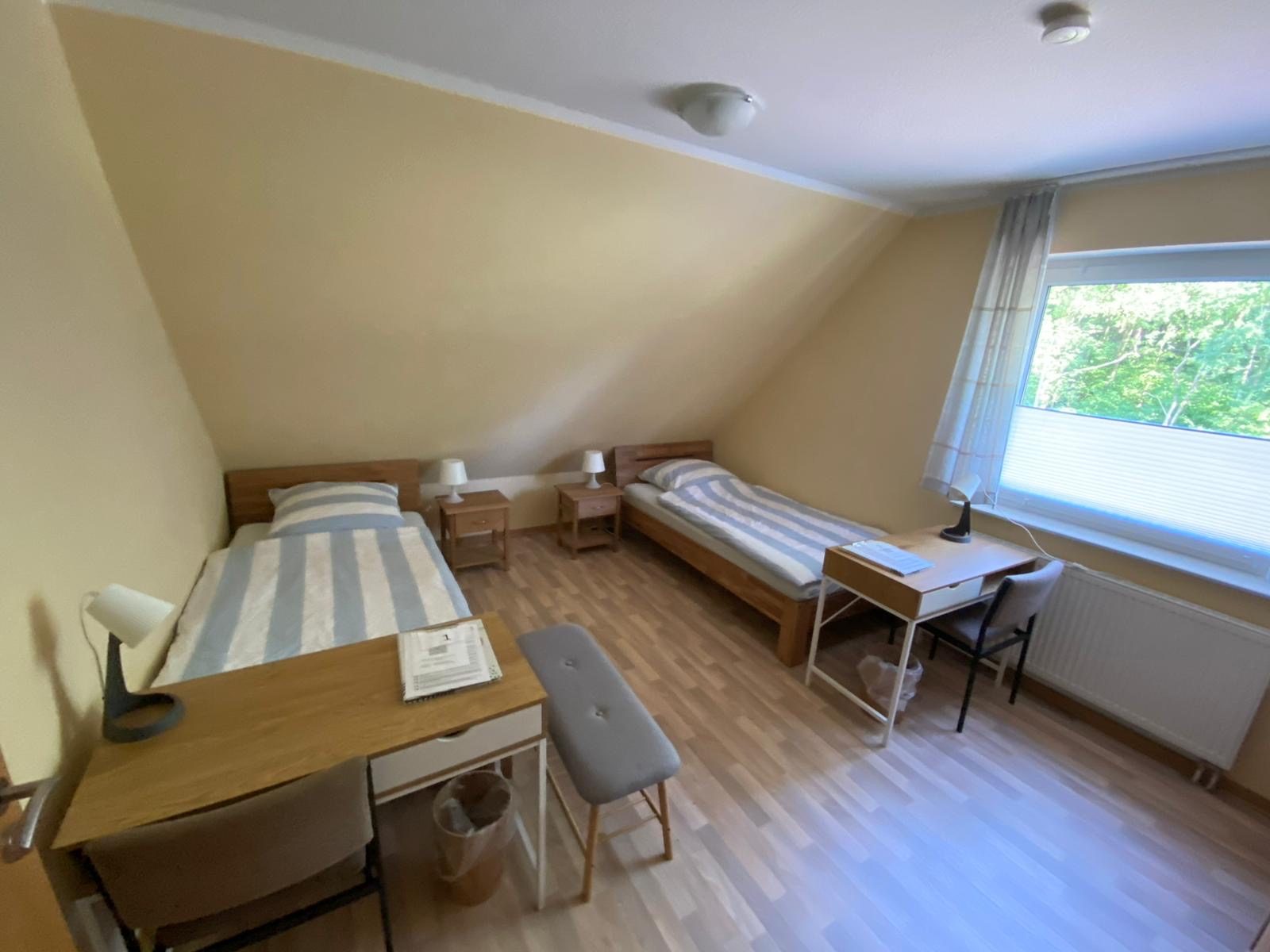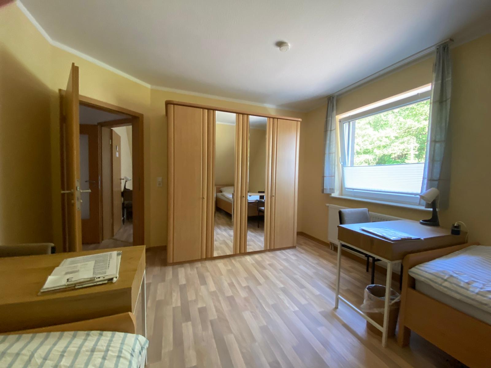 Doppelzimmer im Haus Willbrok mit zwei Betten, Schreibtisch und Kleiderständer.